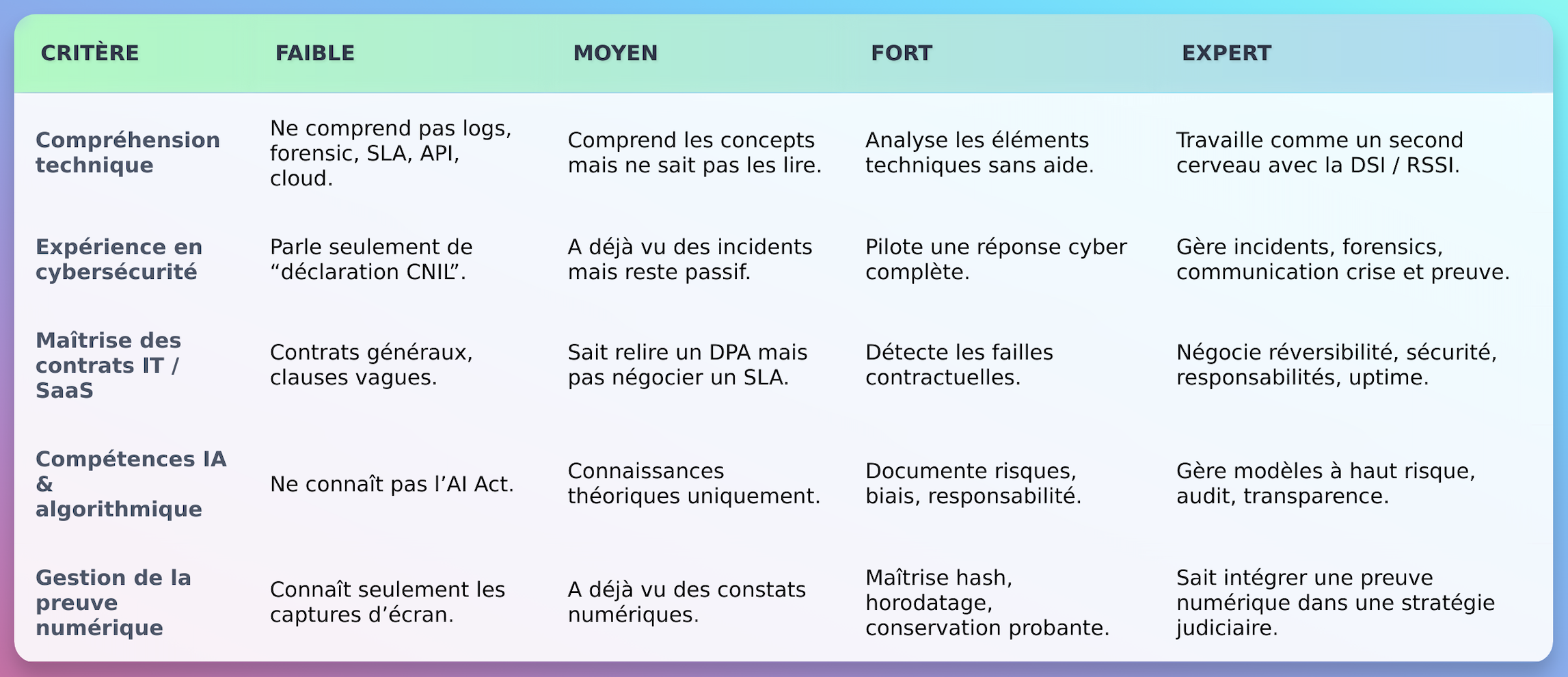 Sa compétence repose sur trois piliers essentiels : Une compréhension technique suffisante pour interpréter un système, Une capacité juridique pour traduire la technique en obligations, Une vision stratégique pour anticiper la responsabilité future.